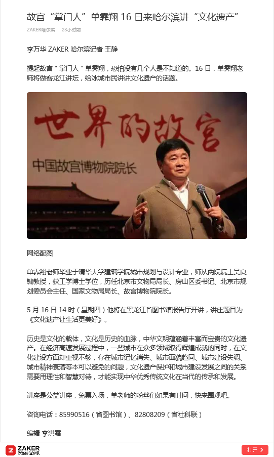 故宫“掌门人”单霁翔 16 日来哈尔滨讲“文化遗产”