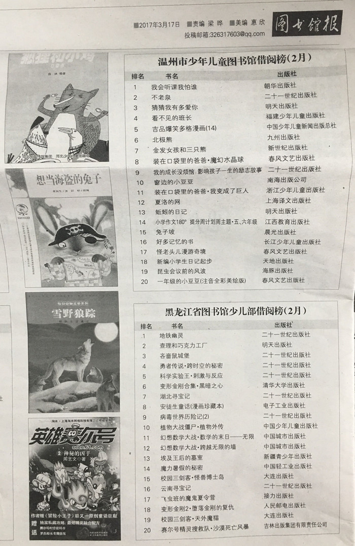黑龙江省图书馆少儿部借阅榜(2月)