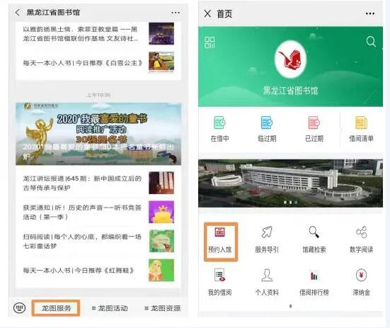第二步:点击“龙图服务”下的“预约入馆”,输入真实姓名、身份证号、手机号并确保身体健康后点击“预约”;
