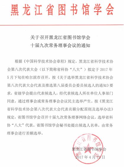 关于召开黑龙江省图书馆学会十届九次常务理事会议的通知