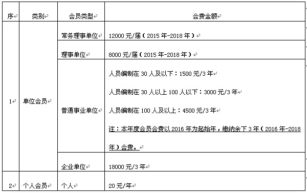 依据《办法》,单位会员会费原则上按届收取(4年/届,2015年-2018年),个人会员会费按年收取。具体收费标准如下: