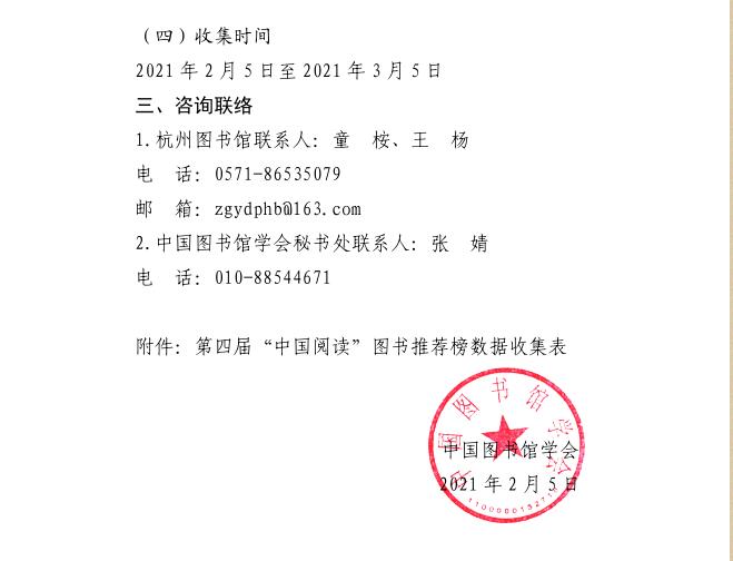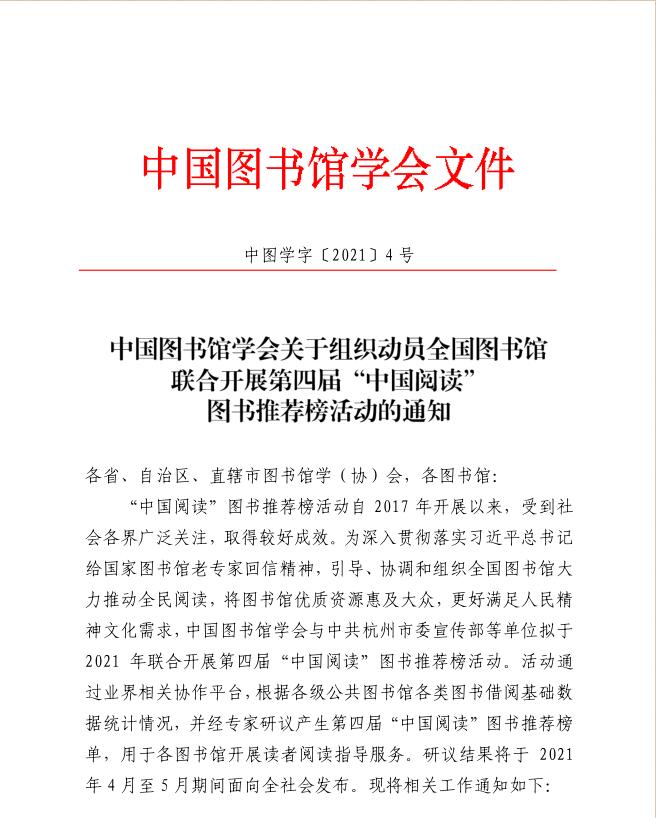 中国图书馆学会关于组织动员全国图书馆联合开展第四届“中国阅读”图书推荐榜活动的通知