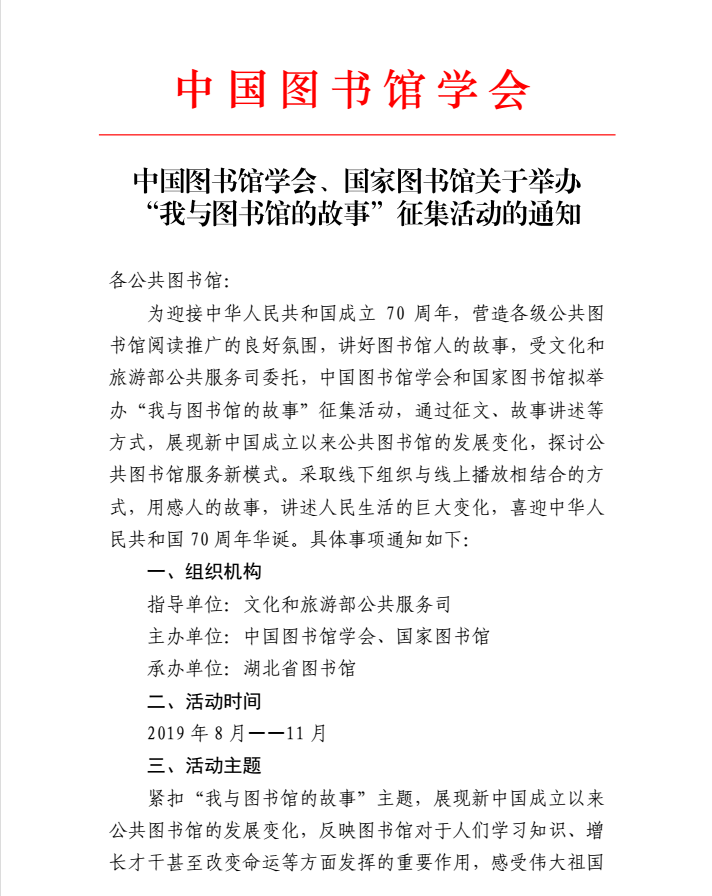 中国图书馆学会、国家图书馆关于举办“我与图书馆的故事”征集活动的通知