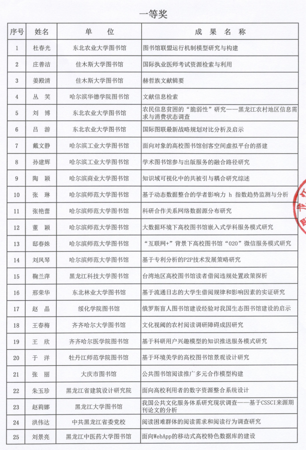 黑龙江省图书馆学会2017年度图书馆优秀科研成果获奖结果