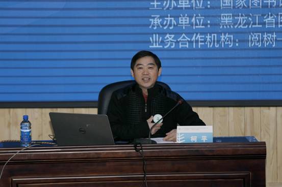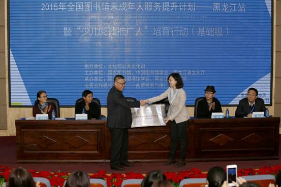 仲岩副秘书长代表主办方向黑龙江省图书馆、黑龙江省图书馆学会颁发感谢状,感谢他们在“全国图书馆未成年服务提升计划”中给予的大力支持和作出的杰出贡献,并授予黑龙江省图书馆“全国图书馆未成年服务提升计划”示范基地。