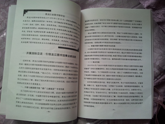 近年来,黑龙江省图书馆学会积极与中国图书馆学沟通联络,开展了与美国、德国公共图书馆和图书馆协会的国际交流活动。搭建了图书馆从业人员学习国外先进经验的专业交流平台,同时也向国外同行展示了中国图书馆事业发展以及取得的成就。“他山之石,可以攻玉”,通过开展国际交流活动的实践,提高了我省图书馆从业人员的业务素质和管理水平,增强了国内外图书馆之间的相互了解,推动了国内外图书馆员之间的交流,促进了我省图书馆事业的发展具有重要意义。