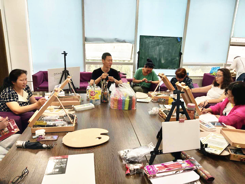 经过杨博老师的讲解,大家对油画有了更加具体的认识,都跃跃欲试,但是在亲自动笔的过程中还是难免遇到这样或那样的问题,杨博老师都会一一指导,使同学们受益匪浅。