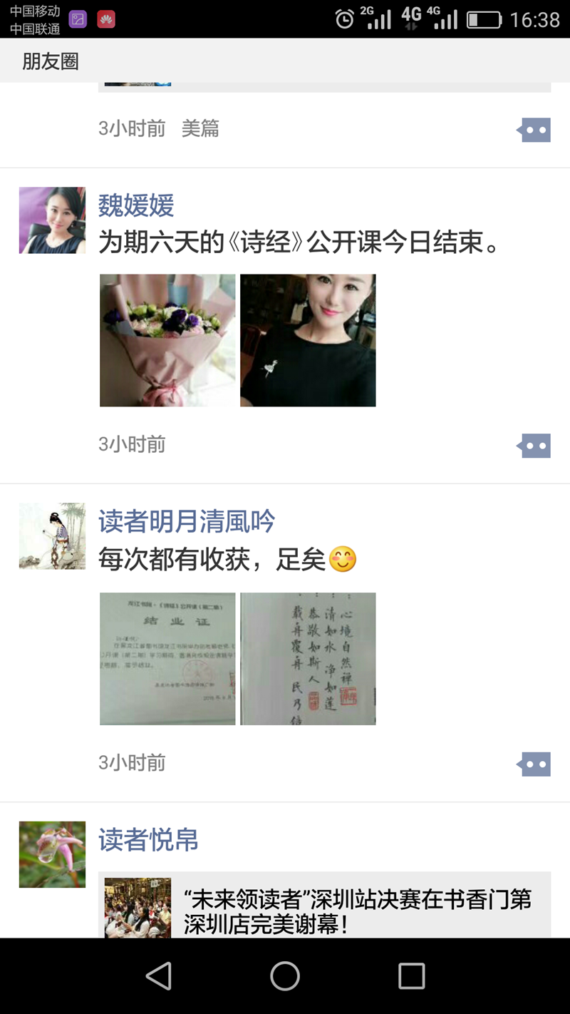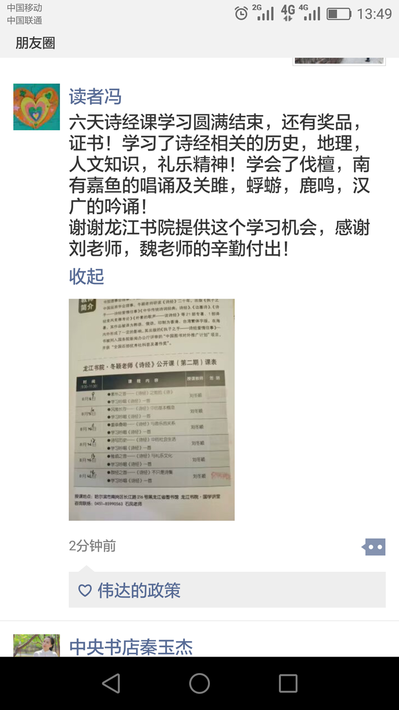 昐望已久的诗经公开课,这么快就结束了,真的让人无限留恋。又开始昐望下一次的课。感谢冬颖、媛媛老师的耐心赐教!感谢王政,石凤老师的精细组织!感谢诗经公开课这个温暖,其乐融融的大家庭!