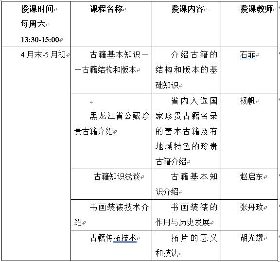 为了让广大读者了解我省古籍保护的现状,掌握古籍保护和修复的基本知识,我们诚邀黑龙江省图书馆古籍整理与修复工作人员开设了这期公开课,授课老师均是从事古籍工作十年以上,并经过国家古籍保护中心多次培训的资深馆员,课程的内容涵盖了古籍版本、古籍检索、书画装裱、古籍修复等层面,期望学员通过近距离的接触古籍、亲自动手传拓碑石等方式,对古籍工作有全面的了解,为中华优秀传统文化的传承和发展助力。