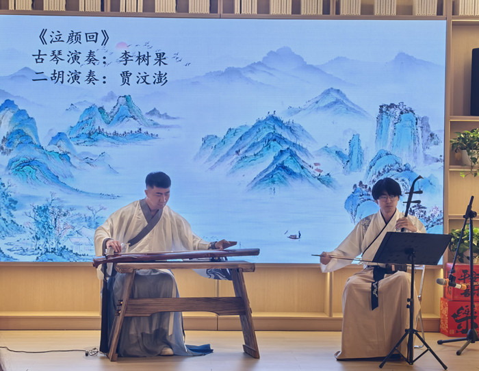 开场一曲《忆故人》婉转低徊,寄托对逝者的深切追思;《湘妃怨》的凄美旋律则让听众仿佛穿越千年,感受娥皇女英的忠贞之情。古筝独奏《渔舟唱晚》以灵动音色描绘夕阳西下,碧波万顷,渔人满载丰收,欸乃归舟的动人情景,为雅集增添一抹诗意画境。下半场的《归去来辞》《慨古吟》《良宵引》《酒狂》《鸥鹭忘机》等曲目,或恬淡超然,或深沉慨叹,展现了古琴艺术“清微淡远”的美学境界。活动最后,黑龙江省音协古琴专委会主任李树果和贾汶澎带来的《泣颜回》以古琴与二胡的对话,将孔子痛失爱徒的哀思娓娓道来,令观众动容。