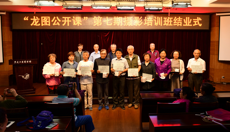 课程结束后,迎来了龙图公开课?第七期摄影培训班结业仪式,出席结业仪式的领导和来宾有黑龙江省图书馆阅读推广部副主任王政,黑龙江省老艺术家协会摄影艺术研究会会长王凯波,黑龙江省民俗摄影协会常务理事姜振宇,黑龙江省老艺术家协会摄影艺术研究会执行主席梁德宪。王政主任和王凯波会长分别对本期摄影班做出总结,摄影班成功举办七期,离不开授课老师的无私奉献和各相关部门的协调、配合和支持,是大家的共同努力把龙图公开课?摄影培训班做成了深受广大摄影爱好者喜爱的品牌活动。本期摄影培训班延续了往期摄影班专业水准高、师资力量强、课程设置合理、报名火爆的特点,同时又增加了配备专门编写的教材、加强课堂管理、外拍实践课等特色,摄影班不断进步的最大动力源自于学员的喜爱。