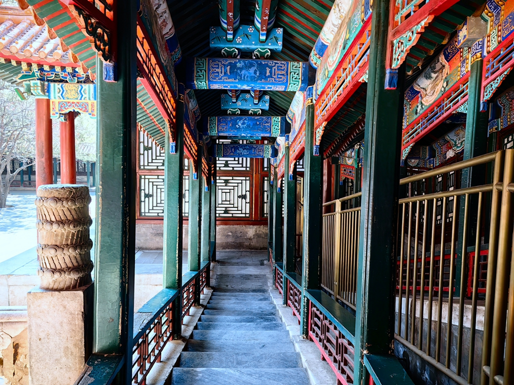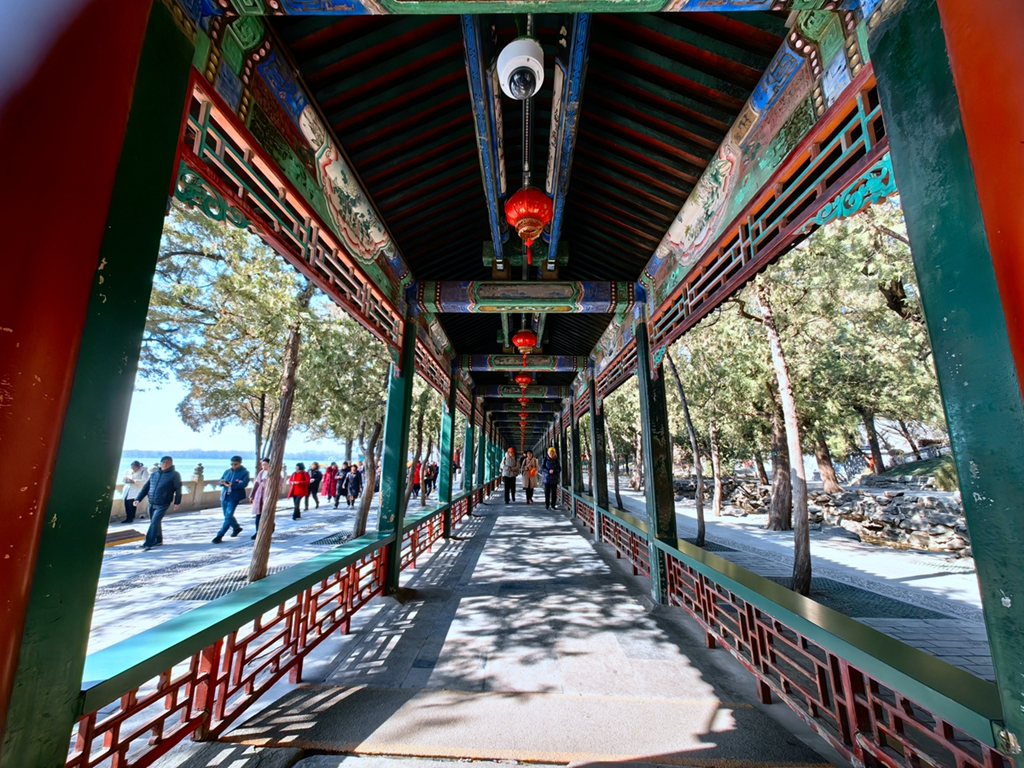 颐和园长廊东起乐寿堂旁邀约门,最西端为石丈亭,中间串联排云门,全长728米。颐和园最富盛名的是彩画,被誉为世界上最长的画廊,一万四千余彩画,色彩艳丽美不胜收,雕梁画栋无与伦比。一步十景,精美绝伦。