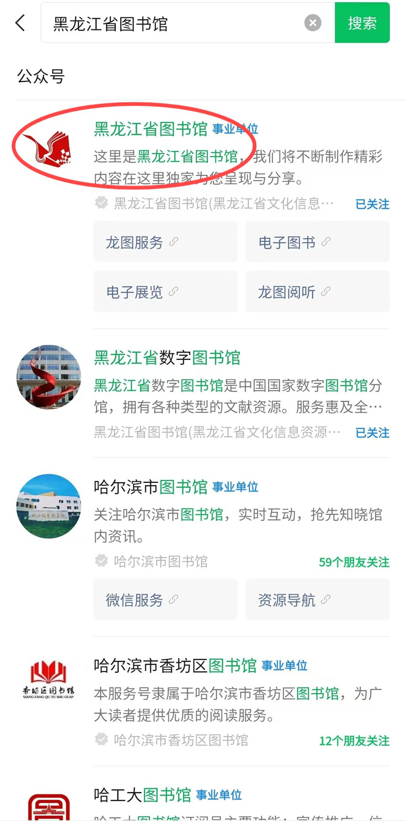 一、打开微信搜索、关注“黑龙江省图书馆”公众号。