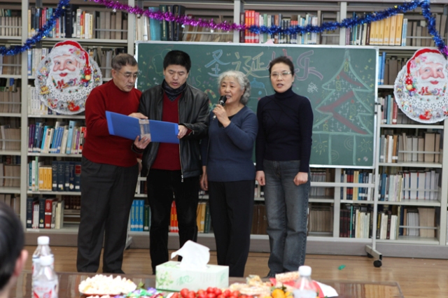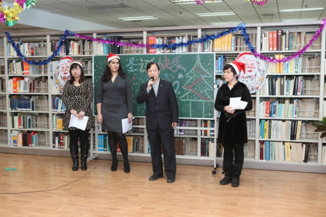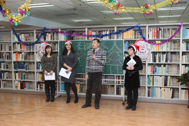 联欢会首先由刘继维副馆长致辞。他代表省图书馆对外语沙龙举办“迎圣诞联欢会”表示衷心的祝贺!“英语沙龙”联办单位哈尔滨海博外语学校朱校长向学员们致以节日的问候!“俄语沙龙”联办单位哈尔滨莱特外语学校闫主任代表学校向大家献歌一曲——大海。
