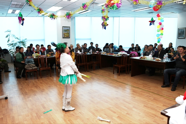 联欢会有20多个节目,cici为大家演唱英文歌曲“My love”,王亚琴女士为大家朗诵了俄罗斯诗歌《我站着,如同森林中的一棵树》,沈朋远为大家跳了一段民族舞蹈,看图说话和摸鼻子等游戏节目吸引了众多的小朋友,他们欢快的唱着、跳着,争先恐后的和外教交流,给联欢会增添了很多喜庆色彩。