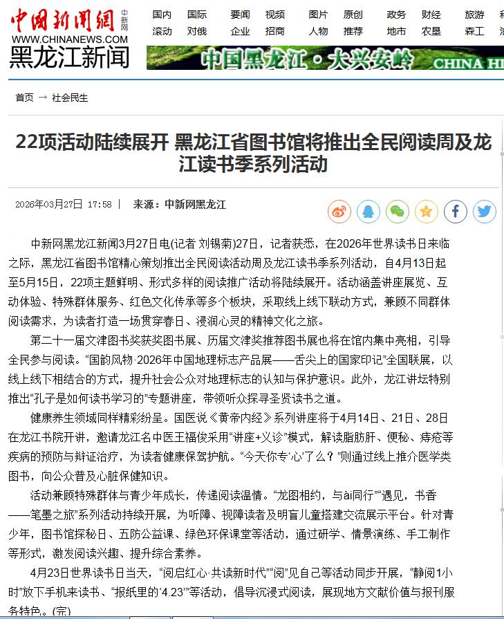22项活动陆续展开 黑龙江省图书馆将推出全民阅读周及龙江读书季系列活动