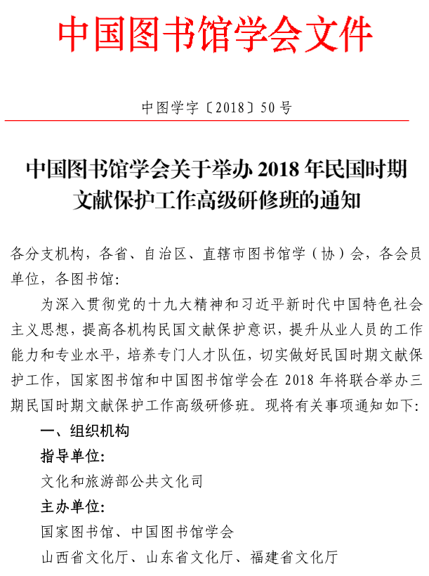 中国图书馆学会关于举办2018年民国时期文献保护工作高级研修班的通知