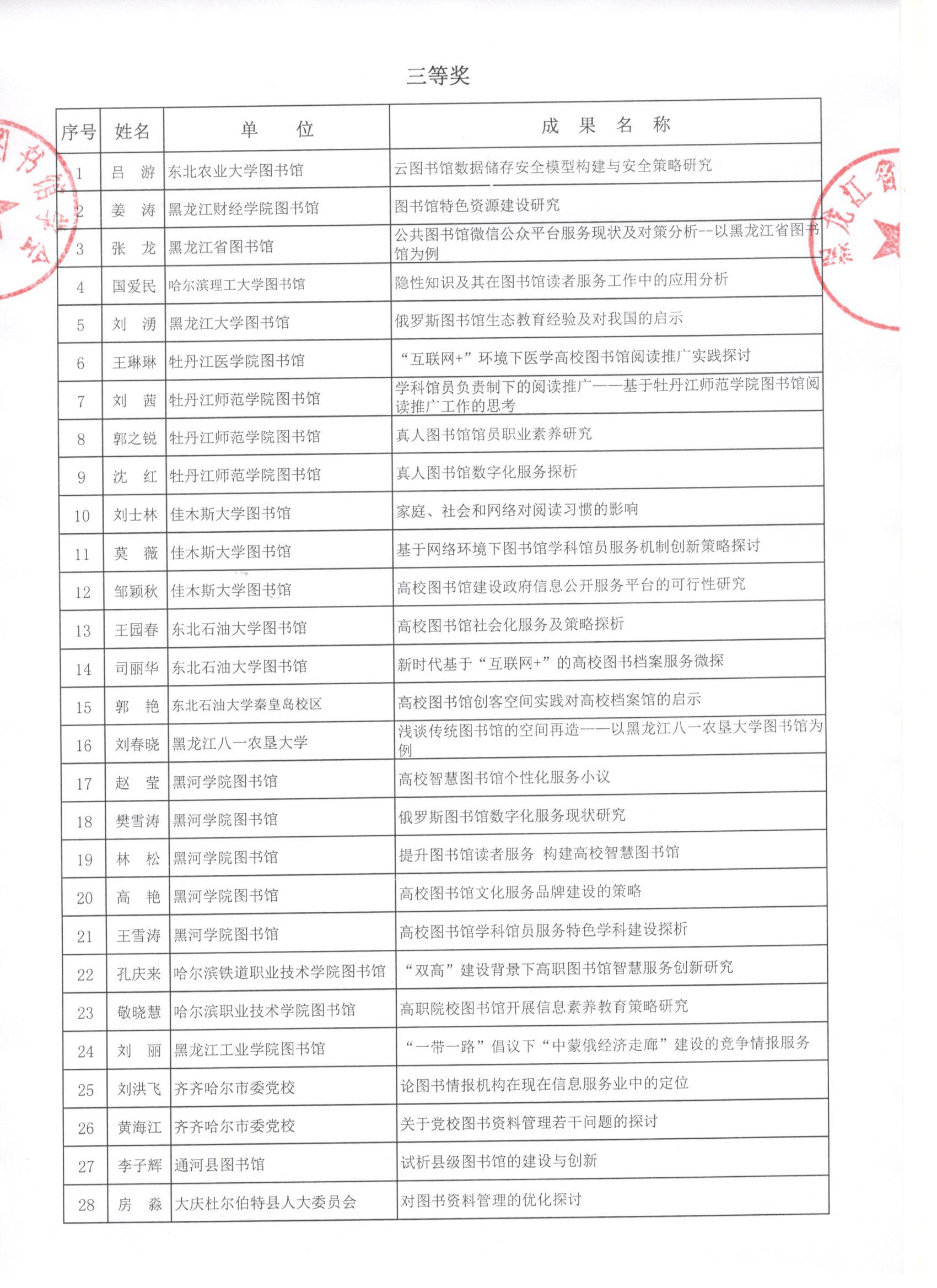黑龙江省图书馆学会2019年度图书馆学优秀科研成果评审结果公示