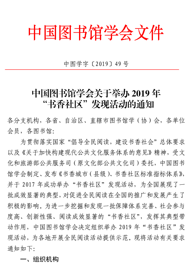 中国图书馆学会关于举办2019年“书香社区”发现活动的通知