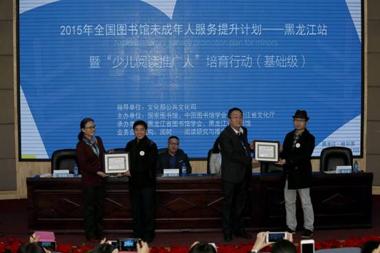 仲岩副秘书长代表主办方向黑龙江省图书馆、黑龙江省图书馆学会颁发感谢状,感谢他们在“全国图书馆未成年服务提升计划”中给予的大力支持和作出的杰出贡献,并授予黑龙江省图书馆“全国图书馆未成年服务提升计划”示范基地。